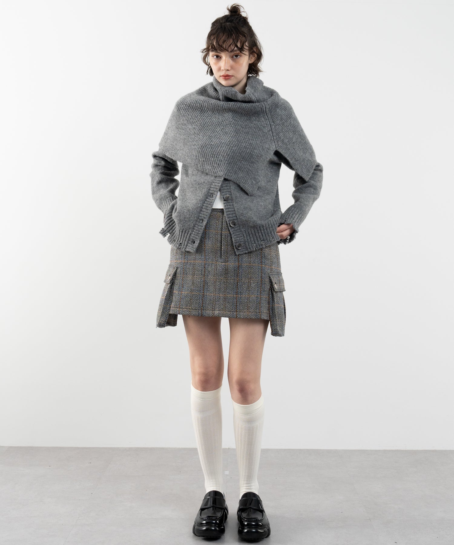 ビッグスヌード付きの2wayニットカーディガン。カーディガンの袖口と裾はダメージ加工のフリンジ仕立てになっていて、遊び心のあるデザインが魅力的。スヌードのサイドにはスリットを入れて抜け感もプラス。スタイリングに合わせてスヌードを脱着したり、カーディガンのボタンを開けたり、こなれたスタイリングが楽しめます。
